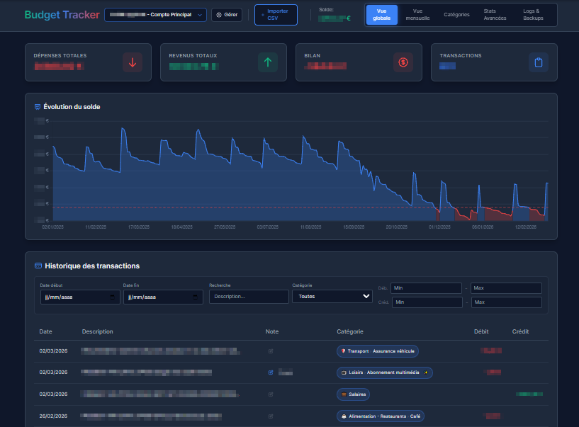 Application web locale de gestion financière personnelle avec import CSV bancaire, catégorisation intelligente, suivi multi-comptes et tableaux de bord interactifs.